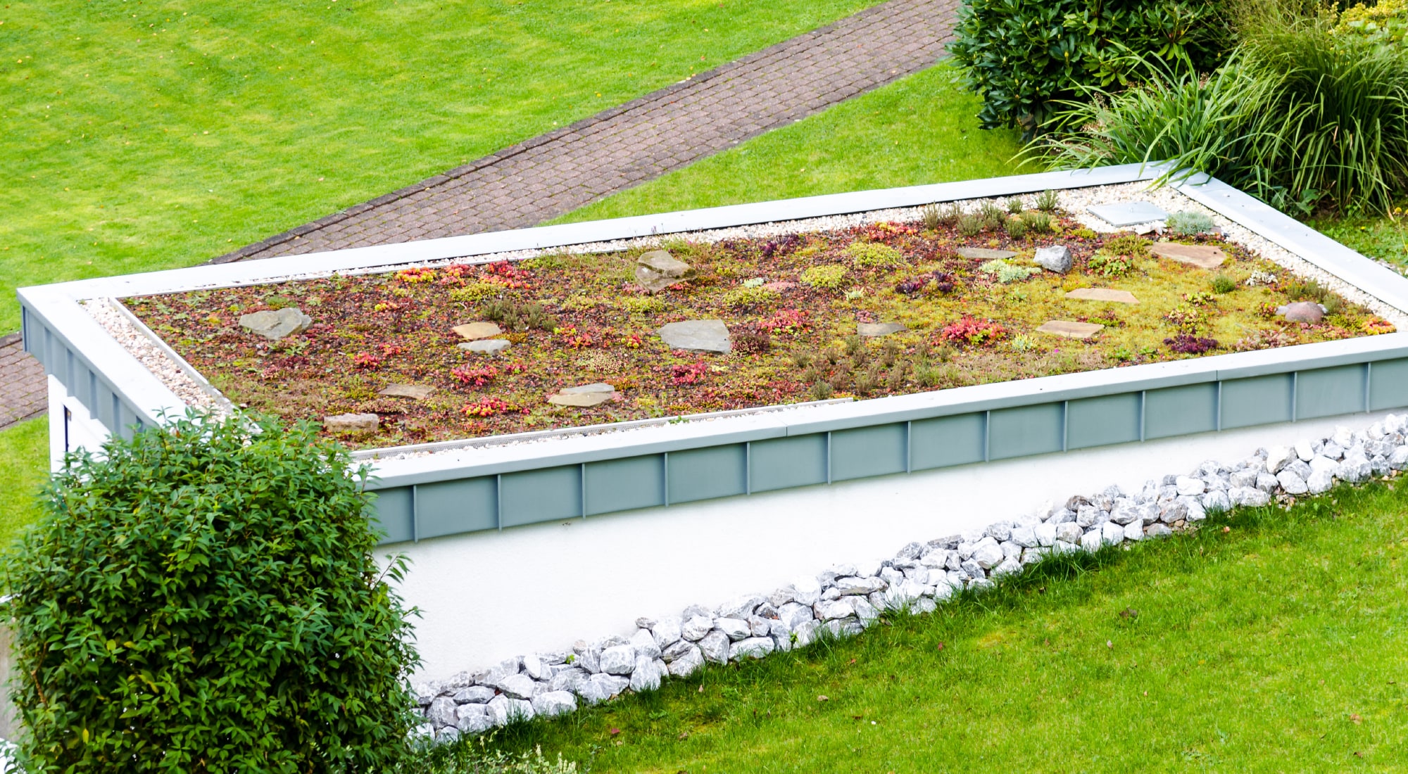 Eine Dachbegrünung hat eine Vielzahl an positiven Effekten. Sie bindet durch die Pflanzen CO2, erzeugt Sauerstoff, sorgt für Regenwasserrückhalt bei Starkregen und wirkt im Sommer kühlend.